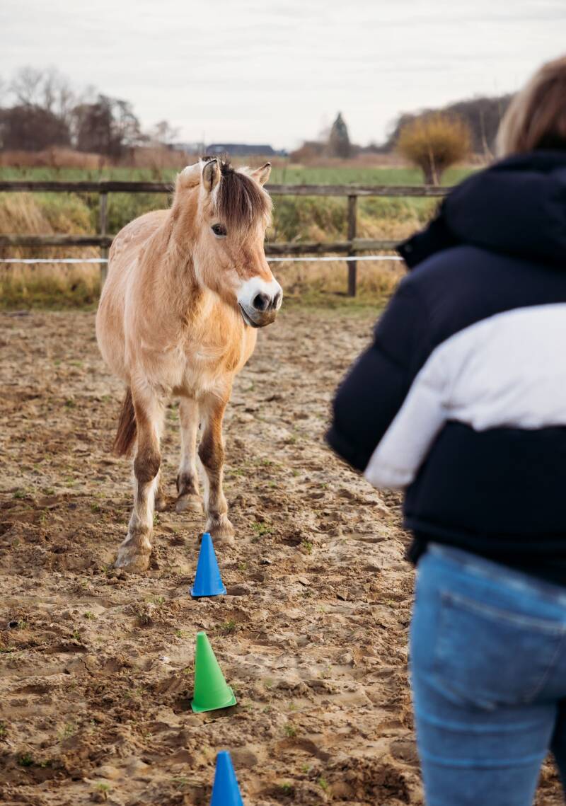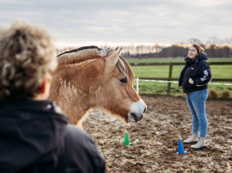 Als we beginnen gaan we bij het paard staan en dan kijken we wat er gebeurt. Hoe het paard op jou reageert.